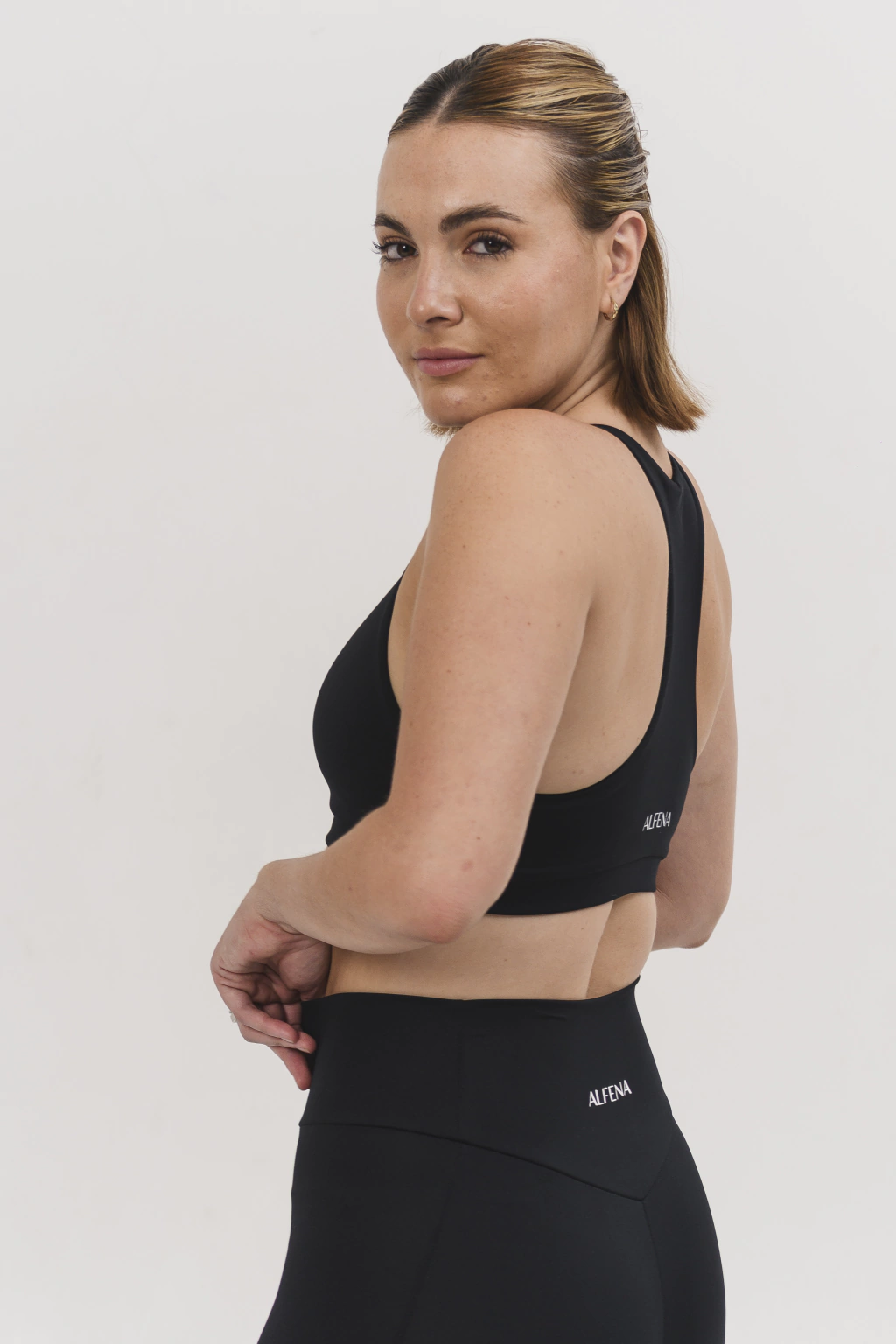 Descubrí el Top Sun en color negro, un top deportivo confeccionado con doble tela embolsado que te ofrece un soporte excepcional. Su diseño incluye un elástico del contorno y un bajo busto escondido, asegurando un ajuste perfecto y evitando cualquier tipo de transparencias.